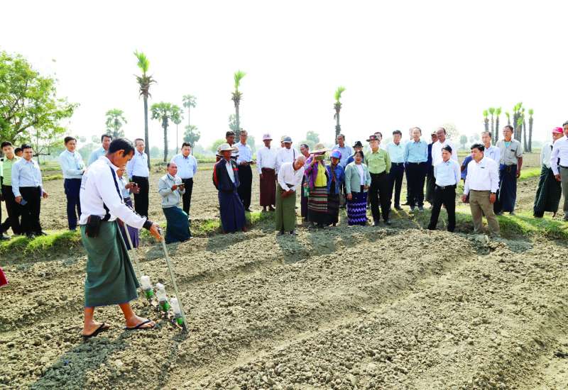စိုက်ပျိုးရေး၊ မွေးမြူရေးနှင့် ဆည်မြောင်းဝန်ကြီးဌာန ပြည်ထောင်စုဝန်ကြီး ဦးမင်းနောင်သည် မန္တလေးတိုင်းဒေသကြီး သယံဇာတနှင့်ပတ်ဝန်းကျင် ထိန်းသိမ်းရေးဝန်ကြီး ဦးရွှေဇင်နှင့်အတူ ယမန်နေ့နံနက်ပိုင်းတွင် မိတ္ထီလာမြို့နယ် တောမအုပ်စုဥယျာဉ်ကျေးရွာရှိ မိတ္ထီလာတောင်ကန် ဥယျာဉ်မြောင်း ရေသောက်စနစ်အတွင်း နွေနှမ်း (ဆင်းရတနာ ၃) မျိုးများကို ပေါင်ကြီးတင်စနစ်ဖြင့် စိုက်ပျိုးထားသော တောင်သူများ၏ ဧက ၅၀ စံပြစိုက်ခင်းကို ကြည့်ရှုစစ်ဆေးသည်။