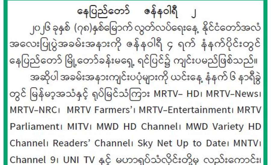 (၇၈)နှစ်မြောက်လွတ်လပ်ရေးနေ့ကို ကြိုဆိုဂုဏ်ပြုသောအားဖြင့် ပြည်ထောင်စုစာရင်းစစ်ချုပ်ရုံး ဝန်ထမ်းမိသားစု အားကစားပြိုင်ပွဲများကို ယနေ့နံနက်ပိုင်းတွင် နေပြည်တော်ရှိ ပြည်ထောင်စုစာရင်းစစ်ချုပ်ရုံး၊ အဆင့်မြင့်စာရင်းကိုင်နှင့် စာရင်းစစ်သင်တန်းကျောင်းရှေ့ ရင်ပြင်ကျယ်၌ ကျင်းပသည်။