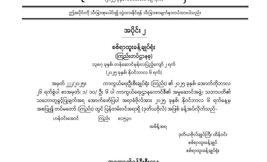 ပြည်ထောင်စုသမ္မတမြန်မာနိုင်ငံတော် ပြန်တမ်း အတွဲ (၇၈) အမှတ် (၅၁) အပိုင်း (၂) အား ဖတ်ရှုနိုင်ပါသည်-