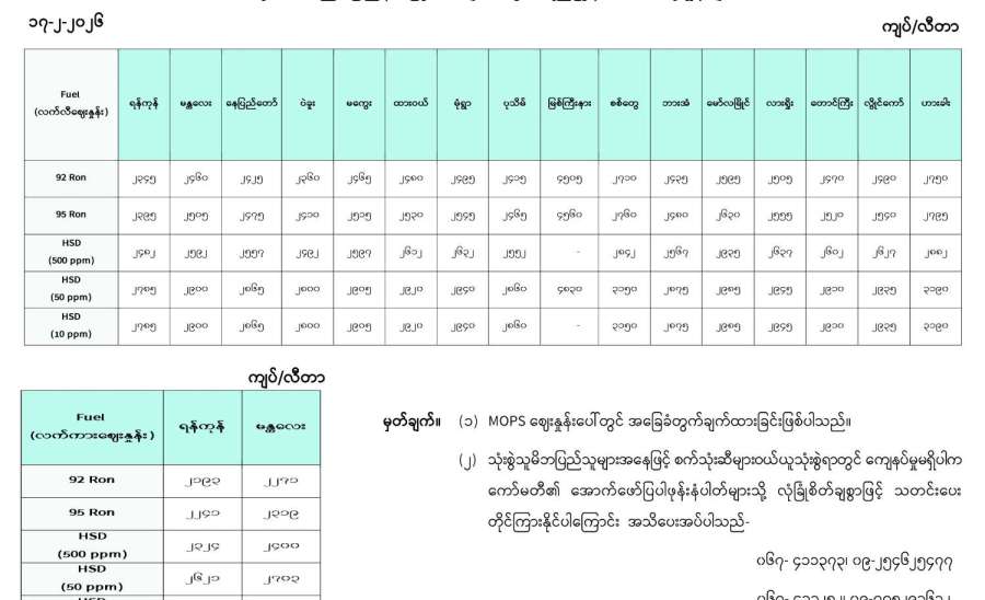 ရန်ကုန်မြို့နှင့် မန္တလေးမြို့အတွက် ရည်ညွှန်းလက်ကားဈေးနှုန်းများနှင့် ပြည်ထောင်စုနယ်မြေ နေပြည်တော်၊ တိုင်းဒေသကြီး/ပြည်နယ် မြို့တော်များအတွက် ရည်ညွှန်းလက်လီဈေးနှုန်းများ