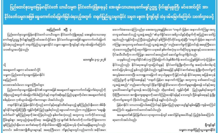 ပြည်ထောင်စုသမ္မတမြန်မာနိုင်ငံတော် ယာယီသမ္မတ နိုင်ငံတော်လုံခြုံရေးနှင့် အေးချမ်းသာယာရေးကော်မရှင်ဥက္ကဋ္ဌ ဗိုလ်ချုပ်မှူးကြီး မင်းအောင်လှိုင် အား နိုင်ငံတော်သမ္မတအဖြစ် ရွေးကောက်တင်မြှောက်ခြင်းခံရသည့်အတွက် တရုတ်ပြည်သူ့သမ္မတနိုင်ငံ သမ္မတ မစ္စတာ ရှီကျင့်ဖျင် ထံမှ ဝမ်းမြောက်ကြောင်း သဝဏ်လွှာပေးပို့