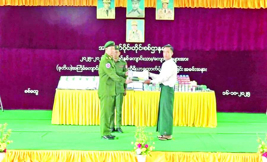 ၂၀၂၅−၂၀၂၆ ပညာသင်နှစ်တွင် တက်ရောက်ပညာသင်ကြားလျက်ရှိသည့် အနောက်ပိုင်းတိုင်းစစ်ဌာနချုပ်မှ တပ်မတော်မိသားစုဝင် ကျောင်းသားကျောင်းသူများအား(ဒုတိယအကြိမ်)ကျောင်းဝတ်စုံနှင့်စာရေးကိရိယာများပေးအပ်ခြင်းကို ယနေ့တွင် စစ်တွေတပ်နယ်ခန်းမ၌ပြုလုပ်ရာ တိုင်းမှူး ဗိုလ်ချုပ်ကျော်စွာဦးနှင့် တာဝန်ရှိသူများ၊ အရာရှိ၊ စစ်သည်၊ မိသားစုများ၊ ကျောင်းသား ကျောင်းသူများ တက်ရောက်ကြသည်။