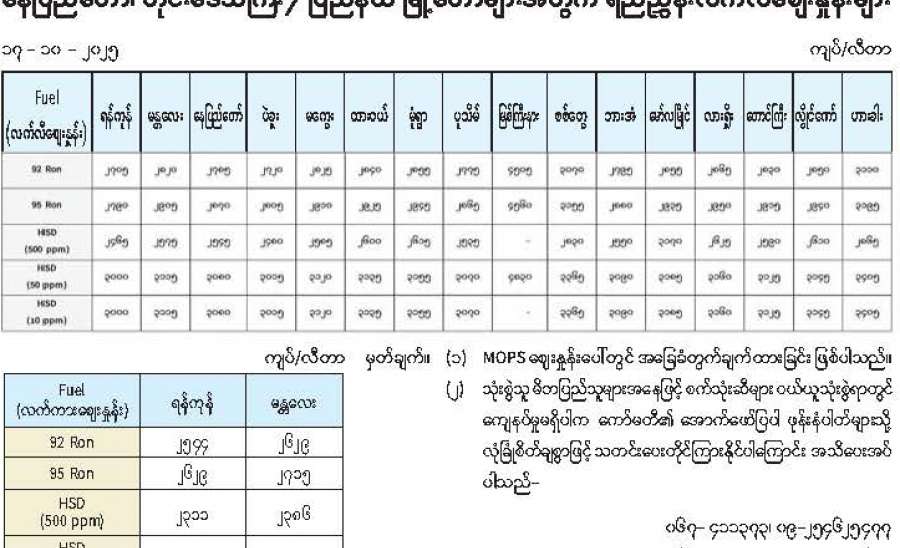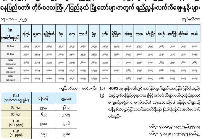 ရန်ကုန်မြို့နှင့် မန္တလေးမြို့အတွက် ရည်ညွှန်းလက်ကားဈေးနှုန်းများနှင့် ပြည်ထောင်စုနယ်မြေ နေပြည်တော်၊ တိုင်းဒေသကြီး/ပြည်နယ် မြို့တော်များအတွက် ရည်ညွှန်းလက်လီစျေးနှုန်းများ