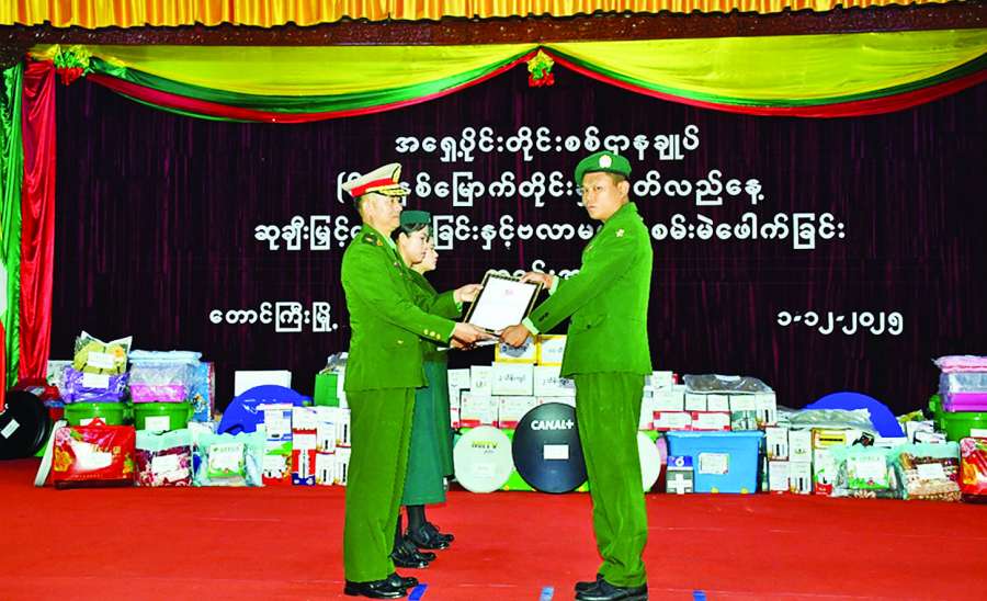 အရှေ့ပိုင်းတိုင်းစစ်ဌာနချုပ်၏ (၆၄)နှစ်မြောက် တိုင်းနှစ်ပတ်လည်နေ့ စစ်ရေးပြအခမ်းအနားကို ယနေ့တွင် တိုင်းစစ်ဌာနချုပ် စစ်ရေးပြကွင်း၌ပြုလုပ်ရာ ရှမ်းပြည်နယ်ဝန်ကြီးချုပ် ဦးအောင်အောင်၊ တိုင်းမှူး ဗိုလ်မှူးချုပ်ကျော်နိုင်ဦးနှင့် တ