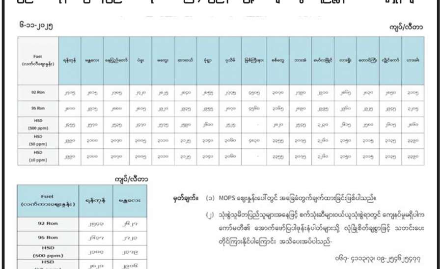 ရန်ကုန်မြို့နှင့် မန္တလေးမြို့အတွက် ရည်ညွှန်းလက်ကားဈေးနှုန်းများနှင့် ပြည်ထောင်စုနယ်မြေ နေပြည်တော်၊ တိုင်းဒေသကြီး/ပြည်နယ် မြို့တော်များအတွက် ရည်ညွှန်းလက်လီဈေးနှုန်းများ