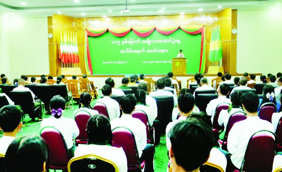 ဗုဒ္ဓဘာသာကလျာဏယုဝအသင်း YMBA ဗဟို၏ (၇၅)ကြိမ်မြောက် စိန်ရတု (၃၈)ဖြာမင်္ဂလာတရားတော်နှင့် ဗုဒ္ဓဝင်စာမေးပွဲဆုချီးမြှင့်ပွဲအခမ်းအနားကို ယနေ့နံနက်ပိုင်းတွင် ရန်ကုန်မြို့၊ ကုန်းမြင့်သာရှိ ဇေယျာသီရိဗိမာန်၌ ကျင်းပပြုလုပ်ရာ ပြည်ထောင်စုသမ္မတမြန်မာနိုင်ငံတော် ယာယီသမ္မတ နိုင်ငံတော်လုံခြုံရေးနှင့်အေးချမ်းသာယာရေးကော်မရှင်ဥက္ကဋ္ဌ ဗုဒ္ဓဘာသာကလျာဏယုဝအသင်း ရာသက်ပန် နာယကကြီး ဗိုလ်ချုပ်မှူးကြီး မင်းအောင်လှိုင် တက်ရောက် အမှာစကားပြောကြားပြီး ဆုများပေးအပ်ချီးမြှင့်သည်။