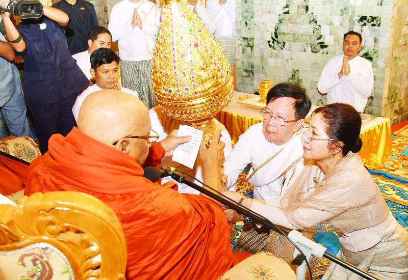 မန္တလေးငလျင်ကြီးကြောင့် ထိခိုက်ပျက်စီးမှုများဖြစ်ပေါ်ခဲ့သည့် မန္တလေးတိုင်းဒေသကြီး ချမ်းမြသာစည်မြို့နယ် ကျွန်းလုံးဥသျှောင်ရပ်ကွက်ရှိ မဟာမုနိရုပ်ရှင်တော်မြတ်ကြီး၏ ဂန္ဓကုဋိတိုက် ရွှေကျောင်းတော်ကြီးအား ဘက်စုံပြုပြင်မွမ်းမံ၍ ရတနာစိန်ဖူးတော်၊ ငှက်မြတ်နားတော်၊ ရွှေထီးတော် တင်လှူပူဇော်ခြင်းနှင့် ဗုဒ္ဓါ ဘိသေက အနေကဇာတင် မဟာမင်္ဂလာအခမ်းအနားကို ယနေ့နံနက်ပိုင်းတွင်ကျင်းပရာ နိုင်ငံတော်သံဃမဟာနာယကအဖွဲ့ဥက္ကဋ္ဌ၊ သန်လျင်မင်းကျောင်း ပထမပြန်စာသင်တိုက် ပဓာနနာယက အဘိဓဇ မဟာရဋ္ဌဂုရု အဂ္ဂမဟာပဏ္ဍိတ အဂ္ဂမဟာ သဒ္ဓမ္မဇောတိကဓဇ ဒေါက်တာ ဘဒ္ဒန္တ စန္ဒိမာဘိဝံသ၊ နိုင်ငံတော်ဩဝါဒါစရိယ သောဠသမ ရွှေကျင်သာသနာပိုင်ဆရာတော်၊ သီတဂူကမ္ဘာ့ဗုဒ္ဓတက္ကသိုလ်များနှင့် သီတဂူဆေးရုံတော်များ၏ အဓိပတိ အဘိဓဇမဟာရဋ္ဌဂုရု အဘိဓဇအဂ္ဂမဟာ သဒ္ဓမ္မဇောတိက မဟာဓမ္မကထိကဗဟု ဇနဟိတဓရ ဒေါက်တာဘဒ္ဒန္တဉာဏိဿရ အမှူးပြုသည့် ဆရာတော်၊ သံဃာတော် အရှင်သူမြတ်များ ကြွရောက်ချီးမြှင့်တော်မူကြသည်။
