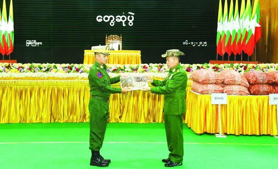 နိုင်ငံတော်ကာကွယ်ရေးနှင့် လုံခြုံရေးတာဝန်ထမ်းဆောင်လျက်ရှိသော တပ်ဖွဲ့ဝင်များအား စားသောက်ဖွယ်ရာများ ချီးမြှင့်ထောက်ပံ့ခြင်းအခမ်းအနားကို ယနေ့နံနက်ပိုင်းက ရခိုင်ပြည်နယ်အစိုးရအဖွဲ့ ဧည့်ဂေဟာ၌ကျင်းပရာ အမျိုးသားကာကွယ်ရေးနှင့် လုံခြုံရေးကောင်စီရုံး အမှုဆောင်ချုပ် ဦးအောင်လင်းဒွေးတက်ရောက်၍ ပေးအပ်ချီးမြှင့်သည်။