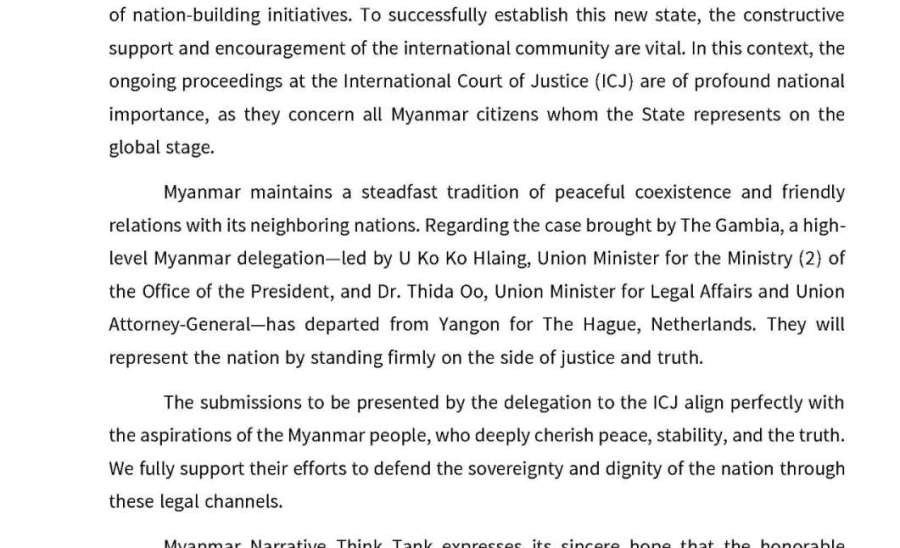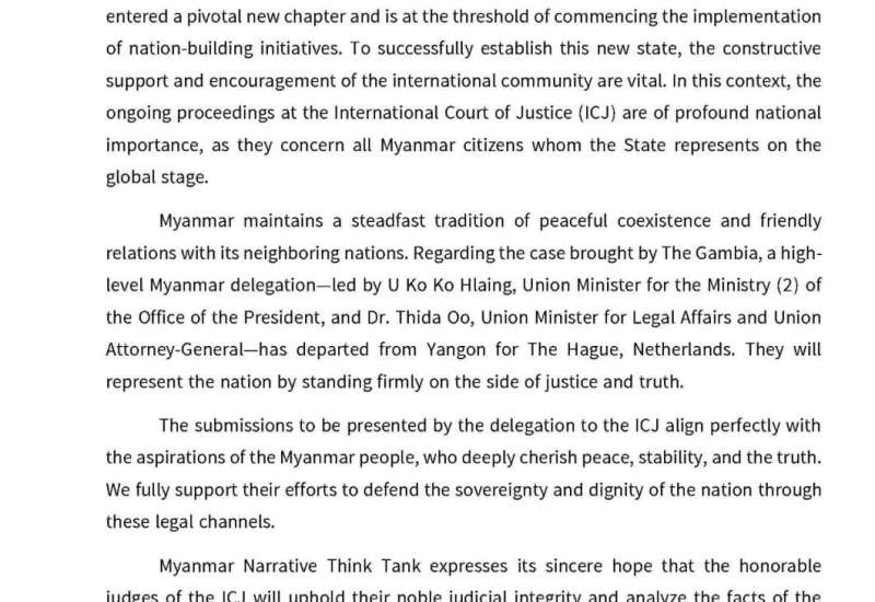 လူမျိုးတုံးသတ်ဖြတ်မှုဆိုသည့် စွပ်စွဲချက်နှင့်ပတ်သက်၍ အပြည်ပြည်ဆိုင်ရာတရားရုံး ကြားနာပွဲသို့တက်ရောက်ရန် သမ္မတရုံးဝန်ကြီးဌာန(၂) ပြည်ထောင်စုဝန်ကြီး ဦးကိုကိုလှိုင်နှင့် ဥပဒေရေးရာဝန်ကြီးဌာန ပြည်ထောင်စုဝန်ကြီးနှင့် ပြည်ထောင်စုရှေ့နေချုပ် ဒေါက်တာသီတာဦးတို့ ဦးဆောင်သည့် ကိုယ်စားလှယ်အဖွဲ့သည် ဇန်နဝါရီလ ၉ ရက် နံနက်ပိုင်းတွင် မြန်မာနိုင်ငံမှ ထွက်ခွာသွားခဲ့ပြီး ယခုအခါနယ်သာလန်နိုင်ငံသည်ဟိတ်ဂ်မြို့တွင် ရောက်ရှိနေပြီဖြစ်သည်။ ဇန်နဝါရီ ၁၂ ရက်မှ ၂၉ ရက်အထိ ကျင်းပမည့် အဆိုပါတရားရုံးကြားနာပွဲတွင် မြန်မာနိုင်ငံက ဇန်နဝါရီ ၁၆ ရက်မှ ၂၀ ရက်အထိလည်းကောင်း၊ ဇန်နဝါရီ ၂၈ ရက်မှ ၂၉ ရက်အထိလည်းကောင်း နှစ်ကြိမ်လျှောက်လဲရမည်ဖြစ်သည်။