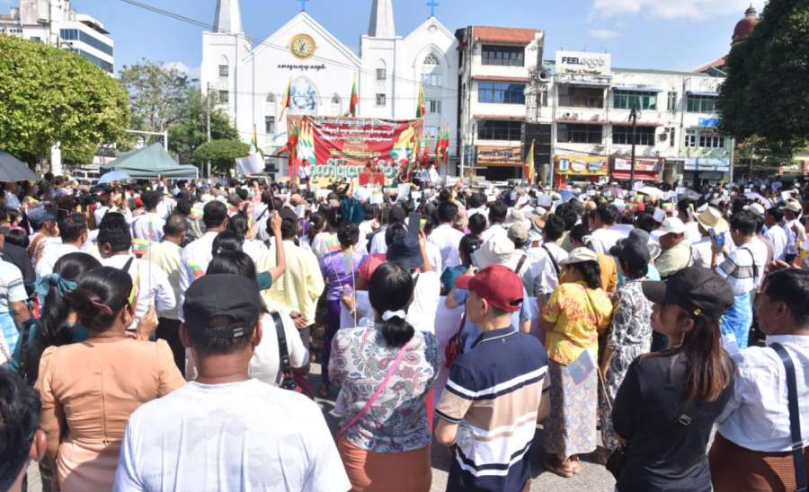 ပြည်ထောင်စုသမ္မတမြန်မာနိုင်ငံတော်၏ ဂုဏ်သိက္ခာနှင့် တရားမျှတသော အမှန်တရားအတွက် နယ်သာလန်နိုင်ငံ၊ သည်ဟိတ်ဂ်မြို့၊ အပြည်ပြည်ဆိုင်ရာတရားရုံး (ICJ) ၌ သွားရောက်ဖြေရှင်းနေသော မြန်မာကိုယ်စားလှယ်အဖွဲ့၏ လျှောက်လဲချေပချက်များအား ထောက်ခံဂုဏ်ပြုပွဲနှင့် ဂမ်ဘီယာနိုင်ငံ၏ မဟုတ်မမှန်စွပ်စွဲချက်များကို ကန့်ကွက်ရှုတ်ချသည့် အမျိုးသားရေးဆန္ဒထုတ်ဖော်ပွဲကို ယနေ့မွန်းလွဲပိုင်းတွင် ရန်ကုန်မြို့၊ မြို့တော်ခန်းမရှေ့၊ ယာဉ်ရပ်နားကွင်း၌ ပြုလုပ်ရာ မျိုးချစ်မြန်မာရဟန်းတော်များသမဂ္ဂမှ သံဃာတော်များ၊ သာသနာနွယ်ဝင် သီလရှင်များ၊ ပြည်သူများ၊ နိုင်ငံရေးပါတီများမှ ပါတီဝင်များ တက်ရောက်ကြသည်။