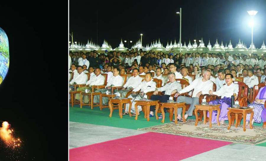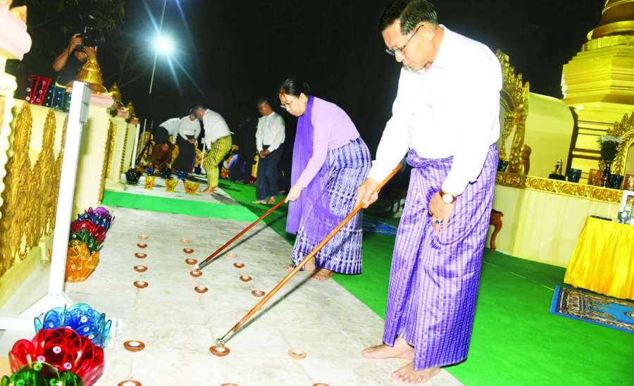ပြည်ထောင်စုနယ်မြေ နေပြည်တော် ဒက္ခိဏသီရိမြို့နယ်ရှိ မာရဝိဇယဗုဒ္ဓရုပ်ပွားတော်မြတ်ကြီး ၂၀၂၅ ခုနှစ်၊ တန်ဆောင်တိုင်မီးထွန်းပွဲတော် မီးပုံးပျံလွှတ်တင်ပူဇော်ပြိုင်ပွဲနှင့် မသိုးရွှေကြာသင်္ကန်း ရက်လုပ်ပူဇော်ပြိုင်ပွဲ ဆုချီးမြှင့်ပွဲအခမ်းအနားကို ယနေ့ညပိုင်းတွင် မာရဝိဇယဗုဒ္ဓဥယျာဉ်တော် အတွင်းရှိ ရေပန်းရင်ပြင်တော်၌ စည်ကားသိုက်မြိုက်စွာဖြင့် ကျင်းပပြုလုပ်ရာ ပြည်ထောင်စုသမ္မတမြန်မာနိုင်ငံတော်ယာယီသမ္မတ နိုင်ငံတော်လုံခြုံရေးနှင့်အေးချမ်းသာယာရေးကော်မရှင်ဥက္ကဋ္ဌ ဗိုလ်ချုပ်မှူးကြီး မင်းအောင်လှိုင် တက်ရောက်ချီးမြှင့်သည်။