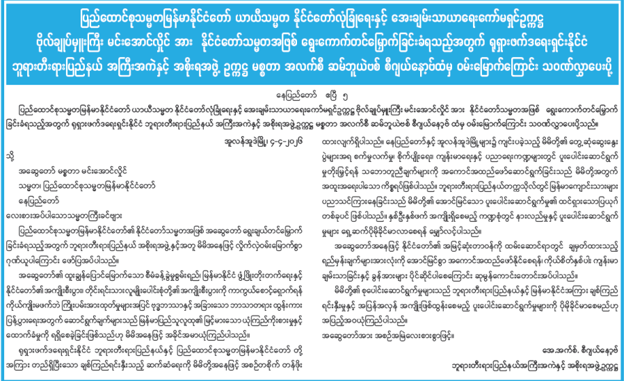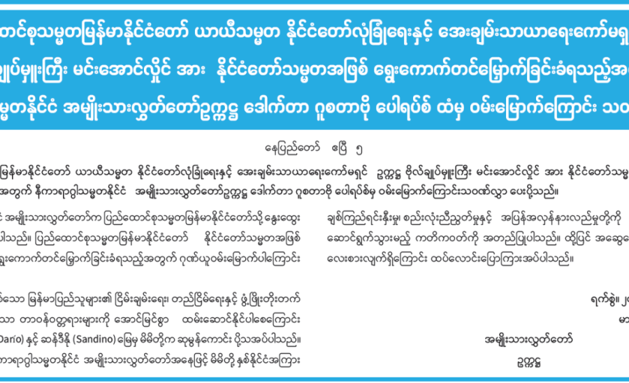 အကောက်ခွန်ဦးစီးဌာနက မဟာသင်္ကြန်ရုံးပိတ်ရက်ကာလအတွင်း လုပ်ငန်းများအဆင်ပြေချောမွေ့အောင် ဆောင်ရွက်ပေးမည်ဖြစ်ကြောင်း အသိပေးကြေညာချက်