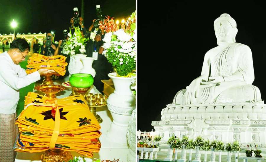 မာရဝိဇယဗုဒ္ဓရုပ်ပွားတော်မြတ်ကြီးအား ၂၀၂၅ ခုနှစ် တန်ဆောင်တိုင်ပွဲတော် မသိုးရွှေကြာသင်္ကန်းဆက်ကပ်လှူဒါန်းခြင်းမဟာမင်္ဂလာအခမ်းအနားကို ယနေ့နံနက် မင်္ဂလာအချိန်တွင် ကျင်းပပြုလုပ်ရာ ပြည်ထောင်စုသမ္မတမြန်မာနိုင်ငံတော်ယာယီသမ္မတ နိ