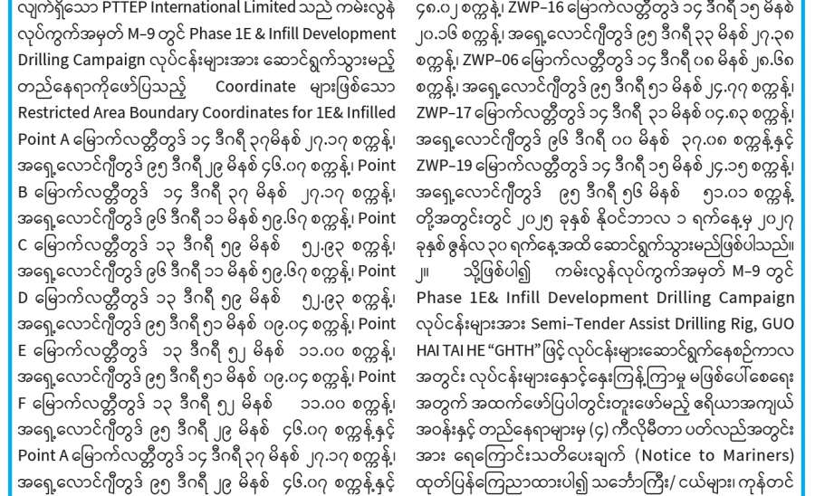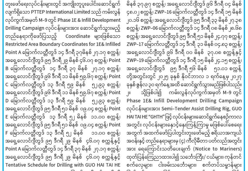 ကိုရီးယားနိုင်ငံရဲ့အကူအညီနဲ့ စွမ်းအားမြှင့်မီးဖိုစီမံကိန်းကိုလည်း ဆောင်ရွက်ခဲ့ပါတယ်။ စီမံကိန်းရဲ့ရည်ရွယ်ချက်က မြန်မာနိုင်ငံမှာ သစ်တောပြုန်းတီးမှုမဖြစ်အောင်၊ ထင်းသုံးစွဲမှုလျှော့ချနိုင်အောင် မီးဖိုထောက်ပံ့ရေးစီမံကိန်းတွေ ဆောင်ရွက်ခဲ့ပါတယ် Oct 27, 2025 ကျေးလက်နေပြည်သူလူထု၏ စုပေါင်းဆုံးဖြတ်ချက်များကို ပူးပေါင်းပါဝင်မှုအားဖြင့်အကောင်အထည်ဖော်စေပြီး ရပ်ရွာအခြေပြုကျေ ရေကြောင်းသတိပေးကြေညာချက် Oct 27, 2025 ရေကြောင်းသတိပေးကြေညာချက် ပွဲကောက်ရေတံခွန်အပန်းဖြေစခန်း( BE.FALLS)သို့ လာရောက်လည်ပတ်သည့် ဧည့်သည်ဝင်ရောက်မှု ၂ ဒသမ ၅ သန်းပြည့် အမှတ်တရ ဂုဏ်ပြုလက်ဆောင်ပေးအပ် Oct 27, 2025 ပြင်ဦးလွင်- လားရှိုးကားလမ်းမကြီးအနီးရှိ ပွဲကောက်ရေတံခွန်အပန်းဖြေစခန်း (BE.FALLS) အား နိုင်ငံတကာအဆင့်မီအပန်းဖြေစခန်းတစ်ခုအဖြစ် အဆင့်မြှင့်တင်ခြင်းလုပ်ငန်းများကိုဆောင်ရွက်ခဲ့ပြီး ၂၀၂၁ ခုနှစ် ဒီဇင်ဘာလတွင်စတင်ဖွင့်လှစ်၍ အနယ်နယ်အရပ်ရပ်မှ လာရောက်လေ့လာအပန်းဖြေသူများဖြင့် စည်ကားများပြားလျက်ရှိသည်။ မရမ်းကုန်းမြို့နယ်၌ အထူးကုဆရာဝန်ကြီးများ အထူးကွင်းဆင်းကုသမှုပေး Oct 27, 2025 ကျန်းမာရေးဝန်ကြီးဌာနအနေဖြင့် ပြည်သူများလိုအပ်သော ကုသမှုများကို ကုန်ကျစရိတ်သက်သာစွာ အလွယ်တကူလက်လှမ်းမီရရှိစေရန်နှင့် လူတိုင်းသက်တမ်းစေ့ သက်ရှည်ကျန်းမာစွာနေနိုင်ရေးအတွက် ရောဂါများကိုစောစီးစွာသိရှိပြီး ကုသမှုခံယူနိုင်စေရန်ရည်ရွယ်၍ ပြည်သူ့ဆေးရုံကြီးများမှ ဘာသာရပ်အလိုက် အထူးကုဆရာဝန်ကြီးများပါဝင်သည့်ကွင်းဆင်းကုသမှုအစီအစဉ်များကို တိုင်းဒေသကြီး/ပြည်နယ်များအလိုက် အကောင်အထည်ဖော် ဆောင်ရွက်လျက်ရှိသည်။ ရေဆင်းစိုက်ပျိုးရေးတက္ကသိုလ်၏ (၃၃)ကြိမ်မြောက် ဘွဲ့နှင်းသဘင်အခမ်းအနားကျင်းပ Oct 27, 2025 ရေဆင်းစိုက်ပျိုးရေးတက္ကသိုလ်၏ (၃၃)ကြိမ်မြောက်ဘွဲ့နှင်းသဘင်အခမ်းအနားကို ယနေ့နံနက်ပိုင်းက နေပြည်တော်ဇေယျာသီရိမြို့နယ် ရေဆင်းရှိ အဆိုပါတက္ကသိုလ် ဘွဲ့နှင်းသဘင်ခန်းမ၌ ကျင်းပသည်။ ပြည်ထောင်စုဝန်ကြီး ဦးဉာဏ်ထွန်း ဦးဆောင်သော မြန်မာကိုယ်စားလှယ်အဖွဲ့ တရုတ်ပြည်သူ့သမ္မတနိုင်ငံ ကျန်းစုပြည်နယ် ရုဒုံမြို့ရှိ ကမ်းလွန်လေအားလျှပ်စစ်စက်ရုံသို့ သွားရောက်လေ့လာ Oct 27, 2025 တရုတ်ပြည်သူ့သမ္မတနိုင်ငံ စူးကျိုးမြို့သို့ရောက်ရှိနေသော လျှပ်စစ်စွမ်းအားဝန်ကြီးဌာန ပြည်ထောင်စုဝန်ကြီး ဦးဉာဏ်ထွန်းဦးဆောင်သော မြန်မာကိုယ်စားလှယ်အဖွဲ့သည် ယမန်နေ့က ကျန်းစုပြည်နယ် ရုဒုံမြို့ ဟွန်ကျန်းပင်လယ်ကွေ့အပြင်ဘက်ရှိ ဒီရေတောကမ်းခြေတွင် China Longyuan Power Group Corporation Limited မှ တည်ဆောက်ထား သော ကုန်းတွင်း၊ ဒီရေတောနှင့် ကမ်းလွန်တို့တွင် တပ်ဆင်အင်အား ၄၈၀ မဂ္ဂါဝပ်ရှိသည့် Ru Dong Huan Gang Offshore Wind Farm ကမ်း