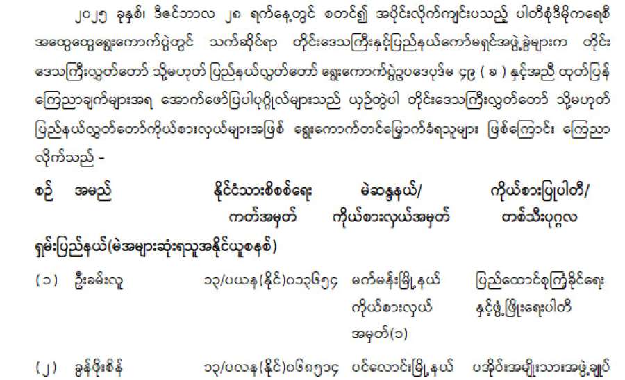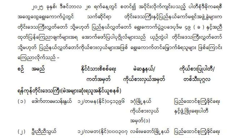 တိုင်းဒေသကြီးလွှတ်တော် သို့မဟုတ် ပြည်နယ်လွှတ်တော်ကိုယ်စားလှယ်အဖြစ် ရွေးကောက်တင်မြှောက်ခံရသူများ အမည်စာရင်းကြေညာခြင်း