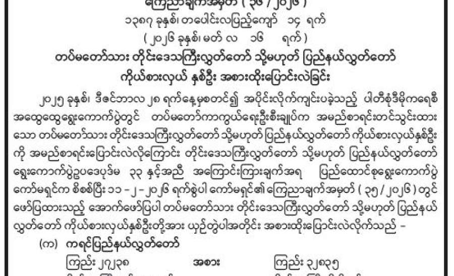 တပ်မတော်သား တိုင်းဒေသကြီးလွှတ်တော် သို့မဟုတ် ပြည်နယ်လွှတ်တော် ကိုယ်စားလှယ်နှစ်ဦး အစားထိုးပြောင်းလဲ