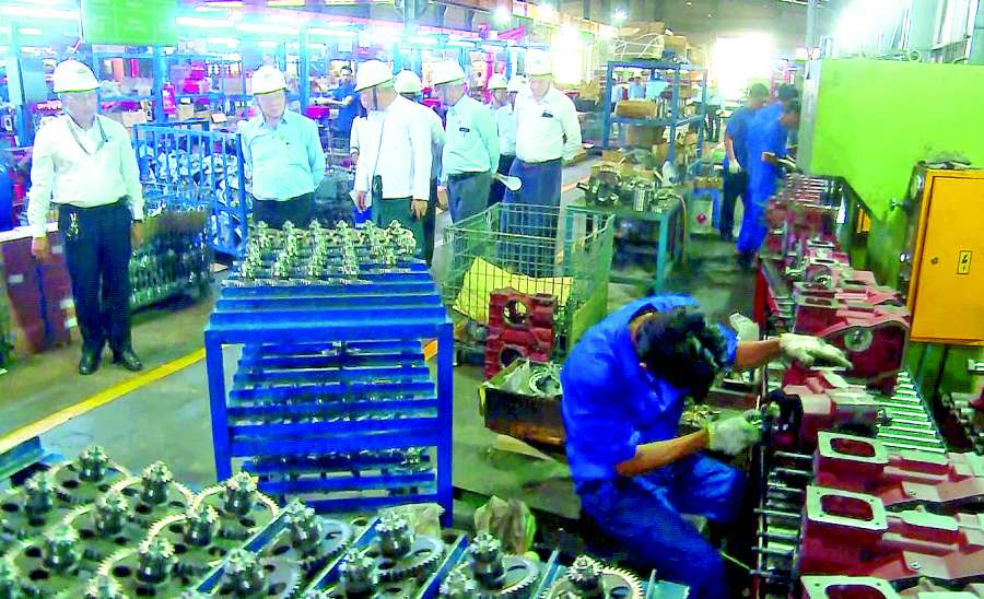 စိုက်ပျိုးရေး၊ မွေးမြူရေးနှင့်ဆည်မြောင်းဝန်ကြီးဌာန ဒုတိယဝန်ကြီး ဦးဗိုလ်ဗိုလ်ကျော်သည် တာဝန်ရှိသူများနှင့်အတူ ယမန်နေ့နံနက်ပိုင်းက ရန်ကုန်တိုင်းဒေသကြီး ဒဂုံမြို့သစ်(တောင်ပိုင်း)မြို့နယ် ရွာသာကြီးရှိ Good Brother’s Co.,Ltd. လယ်ယာသုံး စက်ကိရိယာထုတ်လုပ်ရေးစက်ရုံကို ကြည့်ရှုစစ်ဆေးသည်။