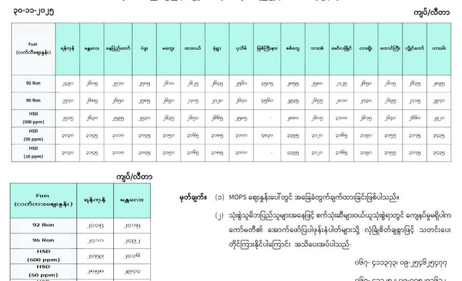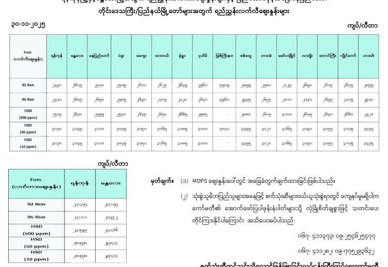 ရန်ကုန်မြို့နှင့် မန္တလေးမြို့အတွက် ရည်ညွှန်းလက်ကားဈေးနှုန်းများနှင့် ပြည်ထောင်စုနယ်မြေ နေပြည်တော်၊ တိုင်းဒေသကြီး/ပြည်နယ် မြို့တော်များအတွက် ရည်ညွှန်းလက်လီဈေးနှုန်းများ