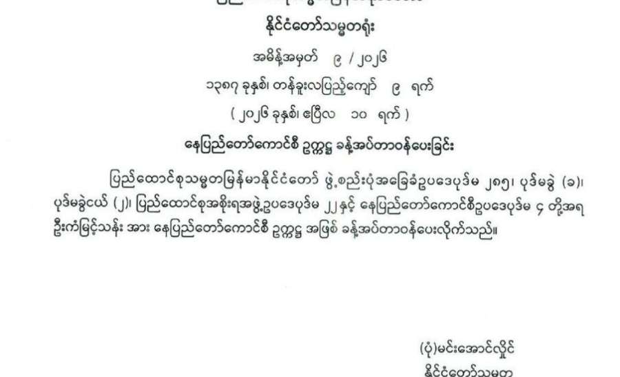 ပြည်ထောင်စုသမ္မတမြန်မာနိုင်ငံတော် သမ္မတ ဦးမင်းအောင်လှိုင်သည် နိုင်ငံတော်သမ္မတအဖြစ် ကတိသစ္စာပြုခြင်းအခမ်းအနားသို့ တက်ရောက်ခဲ့သည့် တရုတ်ပြည်သူ့သမ္မတနိုင်ငံသမ္မတ မစ္စတာရှီကျင့်ဖျင်၏ အထူးကိုယ်စားလှယ်၊ တရုတ်ပြည်သူ့နိုင်ငံရေးအတိုင်ပင်ခံကွန်ဖရင့်၏ ဒုတိယဥက္ကဋ္ဌ H.E. Mr. Jiang Xinzhi ဦးဆောင်သည့် ကိုယ်စားလှယ်အဖွဲ့အား ယနေ့မွန်းလွဲပိုင်းတွင် နိုင်ငံတော်သမ္မတ၏ ဧည့်ဆောင်တော်၌ လက်ခံတွေ့ဆုံသည်။