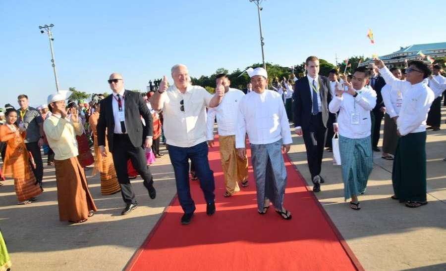 ပြည်ထောင်စုသမ္မတမြန်မာနိုင်ငံတော်ယာယီသမ္မတ နိုင်ငံတော်လုံခြုံရေးနှင့်အေးချမ်းသာယာရေးကော်မရှင်ဥက္ကဋ္ဌ ဗိုလ်ချုပ်မှူးကြီး မင်းအောင်လှိုင်သည် မြန်မာနိုင်ငံသို့ တရားဝင်ချစ်ကြည်ရေးခရီး ရောက်ရှိလာသော ဘယ်လာရုစ်သမ္မတနိုင်ငံသမ္မတ H.E. Mr. Aleksandr Lukashenko အား ယနေ့နံနက်ပိုင်းတွင် သမ္မတအိမ်တော် ဆင်ဖြူတော်ဆောင်ဧည့်ခန်းမ၌ ဂုဏ်ပြုတပ်ဖွဲ့ဖြင့် ကြိုဆိုသည်။