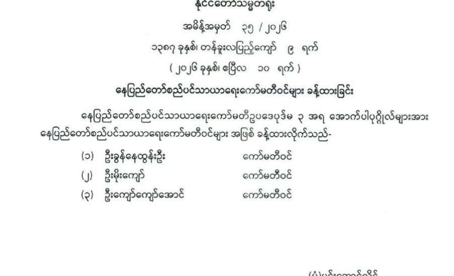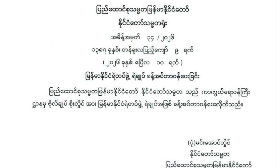 ပြည်ထောင်စုလွှတ်တော်နာယကကြီးနှင့်တကွ ပြည်ထောင်စုလွှတ်တော်ကိုယ်စားလှယ်များ၊ ပြည်ထောင်စုအစိုးရအဖွဲ့ဝင်များ၊ ပြည်ထောင်စုအဆင့်အဖွဲ့အစည်းဝင်များ၊ တက်ရောက်လာကြတဲ့ နိုင်ငံအသီးသီးမှ ကိုယ်စားလှယ်တော်များ၊ မြန်မာနိုင်ငံအခြေစိုက် နိုင်ငံခြားသံရုံးများမှ သံအမတ်ကြီးများ၊ သံတမန်များ၊ တက်ရောက်လာကြသူများနဲ့ မြန်မာနိုင်ငံသူ နိုင်ငံသားများအားလုံး ကိုယ်စိတ်နှစ်ဖြာကျန်းမာချမ်းသာပြီး ကျက်သရေမင်္ဂလာအပေါင်းနဲ့ ပြည့်စုံကြပါစေလို့ ဦးစွာ ဆုမွန်ကောင်းတောင်းရင်း နှုတ်ခွန်းဆက်သအပ်ပါတယ်။