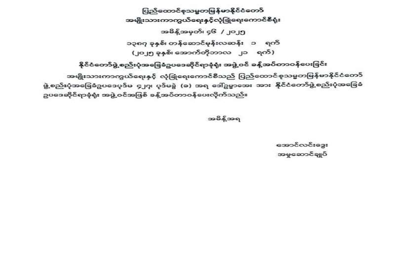 ၁။ ၂၀၂၅ ခုနှစ် ဒီဇင်ဘာလတွင် စတင်ကျင်းပမည့် ပါတီစုံဒီမိုကရေစီအထွေထွေရွေးကောက်ပွဲတွင် ပါဝင်ယှဉ်ပြိုင်ကြမည့် လွှတ်တော်ကိုယ်စားလှယ်လောင်းများသည် သက်ဆိုင်ရာကော်မရှင်အဖွဲ့ခွဲများတွင် ၈ - ၉ - ၂၀၂၅ ရက်နေ့မှ ၂၂ - ၉ - ၂၀၂၅ ရက်နေ့အထိ အမည်စာရင်းတင်သွင်းလွှာများကို တင်သွင်း ခဲ့ကြပြီးဖြစ်ပါသည်။