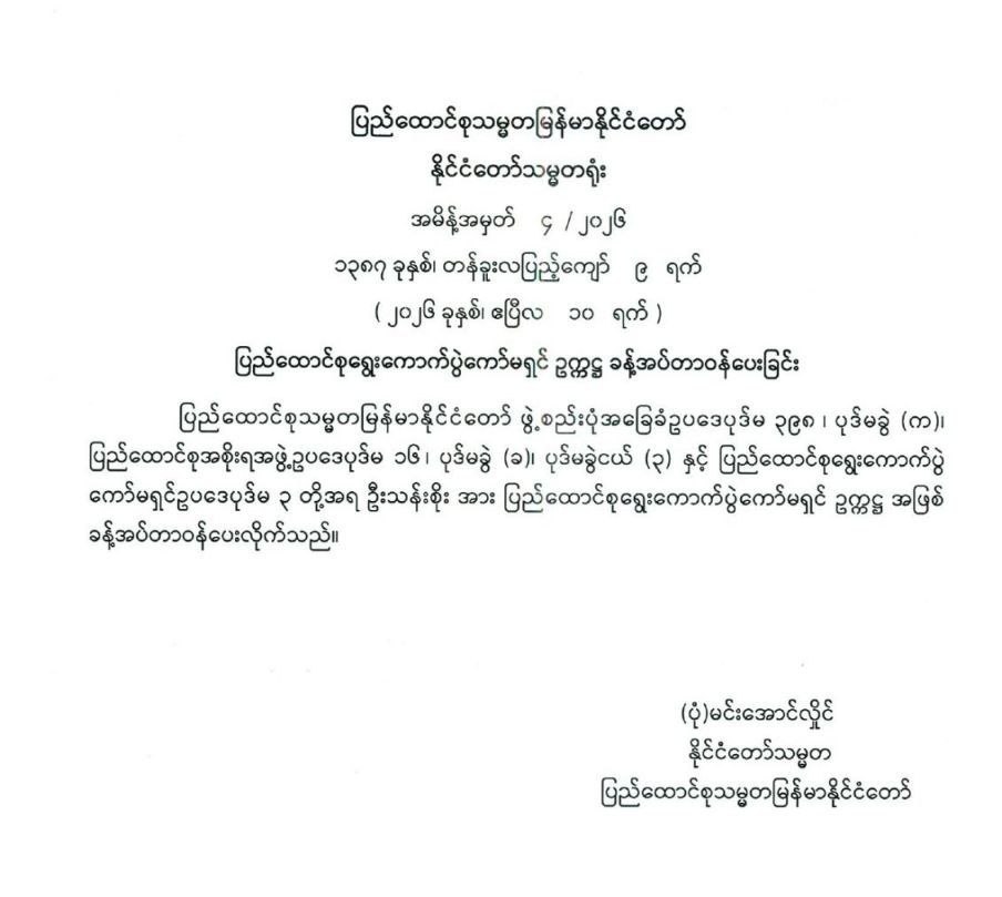ပြည်ထောင်စုရွေးကောက်ပွဲကော်မရှင်ဥက္ကဋ္ဌ ခန့်အပ်တာဝန်ပေးခြင်း