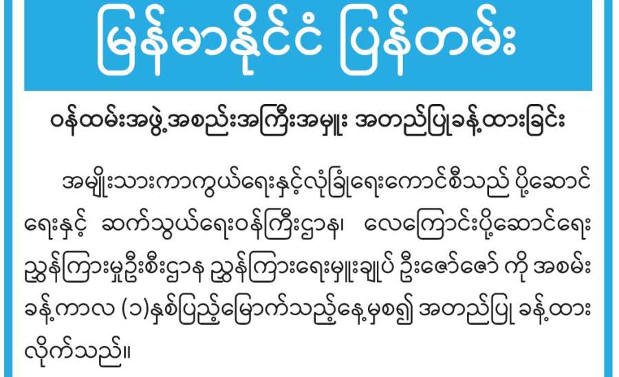 Feb 24, 2026နိုင်ငံတော်အစိုးရက ကျေးလက်နှင့်မြို့ပြ၊ တောင်တန်းနှင့် မြေပြန့်မကျန်လမ်းပန်းဆက်သွယ်ရေး၊ ပညာရေး၊ ကျန်းမာရေးနှင့်လူမှုစီးပွားဘဝဖွံ့ဖြိုးတိုးတက်ရေးတို့အတွက် တစ်ပြေးညီဆောင်ရွက်ပေးလျက်ရှိပါသည်။ ကျေးလက်နှင့် မြို့ပြချိတ်ဆက်မှုကောင်းမွန်စေရန် ကတ္တရာလမ်း၊ ကွန်ကရစ်လမ်းများနှင့် တံတားများ တည်ဆောက်ပေးခြင်း၊ ကျေးလက်နေပြည်သူများ၏ လူမှုစီးပွားဘဝမြင့်မားတိုးတက်စေရန် လျှပ်စစ်မီးရရှိရေး၊ သောက်သုံးရေရရှိရေး ဆောင်ရွက်ပေးခြင်းနှင့် အသေးစား၊ အငယ်စားနှင့် အလတ်စား (MSME) စီးပွားရေးလုပ်ငန်းများကိုမြှင့်တင်ပေးခြင်း စသည်ဖြင့် နိုင်ငံတစ်ဝန်းဖွံ့ဖြိုးတိုးတက်ရေးအတွက် အရှိန်အဟုန်ဖြင့် ဆောင်ရွက်ပေးလျက်ရှိပါသည်။