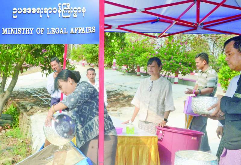 ဥပဒေရေးရာဝန်ကြီးဌာန ဝန်ထမ်းမိသားစုများ ၏ မြန်မာသက္ကရာဇ် ၁၃၈၈ ခုနှစ် မြန်မာနှစ်ဆန်းတစ်ရက်နေ့ ဇီဝိတဒါနအဖြစ် ငါးလွှတ်ပွဲအခမ်းအနားကို ယနေ့ညနေပိုင်းတွင် နေပြည်တော်ရှိ ဥပဒေရေးရာဝန်ကြီးဌာန ရုံးရှေ့တစ်ဖက်ပိတ်လျှိုပိတ်ဆည်၌ကျင်းပရ