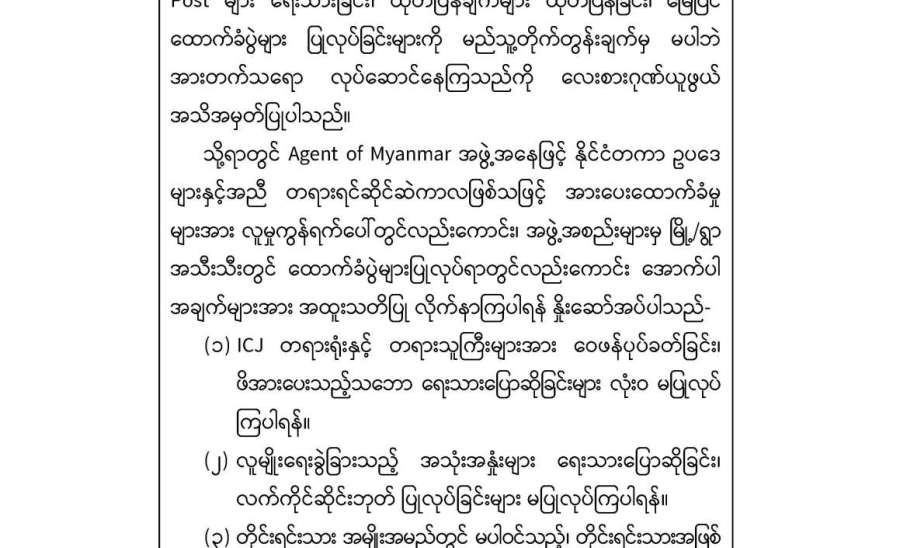 ICJ ကြားနာပွဲတွင် မြန်မာနိုင်ငံကိုယ်စား သွားရောက်ဖြေရှင်းနေသည့် ပြည်ထောင်စုဝန်ကြီး ဦးကိုကိုလှိုင် ဦးဆောင်သော Agent of Myanmar အဖွဲ့အား ပြည်သူတစ်ရပ်လုံးအနေဖြင့် အားပေးထောက်ခံလျက်ရှိသည်ကို ဝမ်းသာဂုဏ်ယူဖွယ် မြင်တွေ့ရပါသည်။