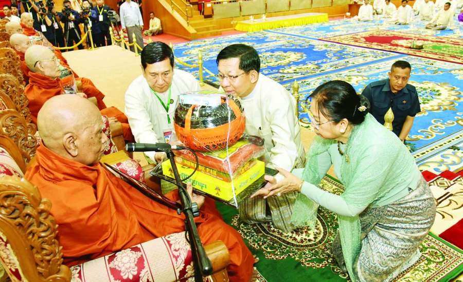 ၂၀၂၆ ခုနှစ်၊ သာသနာတော်ဆိုင်ရာ ဘွဲ့တံဆိပ်တော် ဆက်ကပ်ခံယူတော်မူမည့် ဆရာတော်ကြီးများအား နေ့ဆွမ်းဆက်ကပ်လှူဒါန်းခြင်းကို ယနေ့နံနက်ပိုင်းတွင် နေပြည်တော်၊ မာရဝိဇယဗုဒ္ဓဥယျာဉ်တော်ပရိဝုဏ်အတွင်းရှိ အဂ္ဂါဓိပတိသာသနာ့ဗိမာန်တော်ကြီး၌ ကျင်းပရာ ပြည်ထောင်စုသမ္မတမြန်မာနိုင်ငံတော်ယာယီသမ္မတ နိုင်ငံတော်လုံခြုံရေးနှင့်အေးချမ်းသာယာရေးကော်မရှင်ဥက္ကဋ္ဌ ဗိုလ်ချုပ်မှူးကြီး မင်းအောင်လှိုင်နှင့် ဇနီး ဒေါ်ကြူကြူလှတို့ တက်ရောက်၍ နေ့ဆွမ်းဆက်ကပ်လှူဒါန်းသည်။