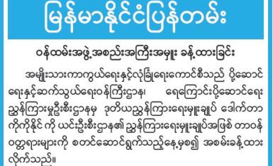 ပြည်ထောင်စုစာရင်းစစ်ချုပ်ရုံးနှင့် ပြန်ကြားရေးဝန်ကြီးဌာနတို့ ပူးပေါင်းဆောင်ရွက်သည့် အခမ်းအနားမှူး (Master of Ceremony) သင်တန်းနှင့် ဓာတ်ပုံ၊ ဗီဒီယိုရိုက်ကူးတည်းဖြတ်မှု (Video Edi-ting) သင်တန်းဖွင့်ပွဲကို ယနေ့မွန်းလွဲ ၂ နာရီတွင် နေပြည်တော်ရှိ ပြည်ထောင်စုစာရင်းစစ်ချုပ်ရုံး နဝရတ်ခန်းမ၌ ကျင်းပသည်။