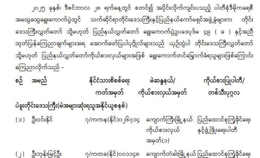 တိုင်းဒေသကြီးလွှတ်တော် သို့မဟုတ် ပြည်နယ်လွှတ်တော်ကိုယ်စားလှယ်အဖြစ် ရွေးကောက်တင်မြှောက်ခံရသူများ အမည်စာရင်းကြေညာခြင်း