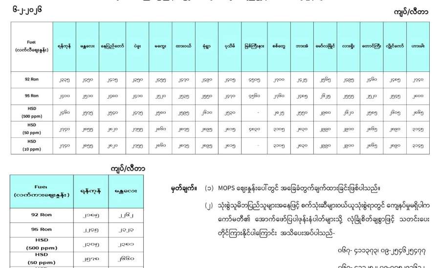 ရန်ကုန်မြို့နှင့် မန္တလေးမြို့အတွက် ရည်ညွှန်းလက်ကားဈေးနှုန်းများနှင့် ပြည်ထောင်စုနယ်မြေ နေပြည်တော်၊ တိုင်းဒေသကြီး/ ပြည်နယ် မြို့တော်များအတွက် ရည်ညွှန်းလက်လီဈေးနှုန်းများ
