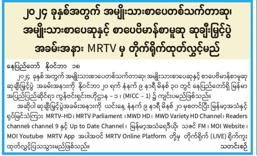 ၂၀၂၄ ခုနှစ်အတွက် အမျိုးသားစာပေတစ်သက်တာဆု၊ အမျိုးသားစာပေဆုနှင့် စာပေဗိမာန်စာမူဆု ဆုချီးမြှင့်ပွဲ အခမ်းအနား MRTV မှ တိုက်ရိုက်ထုတ်လွှင့်မည်