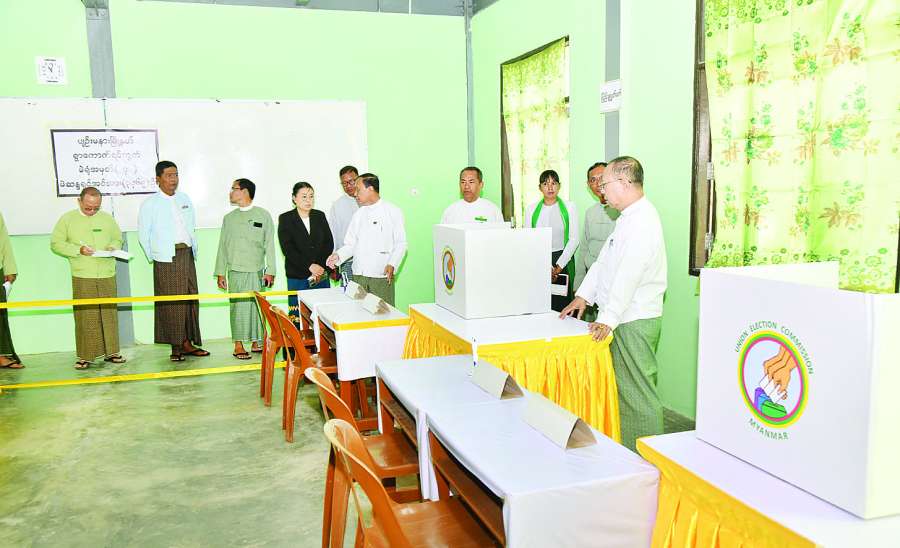 ပြည်ထောင်စုရွေးကောက်ပွဲကော်မရှင်ဥက္ကဋ္ဌ ဦးသန်းစိုးသည် ပြည်ထောင်စုရွေးကောက်ပွဲကော်မရှင်အဖွဲ့ဝင် ပြည်ထောင်စုနယ်မြေ(တာဝန်ခံ) ဦးမျိုးလှိုင်၊ ပြည်ထောင်စုရွေးကောက်ပွဲကော်မရှင်ရုံးမှ တာဝန်ရှိသူများ၊ ပြည်ထောင်စုနယ်မြေ ရွေးကောက်ပ
