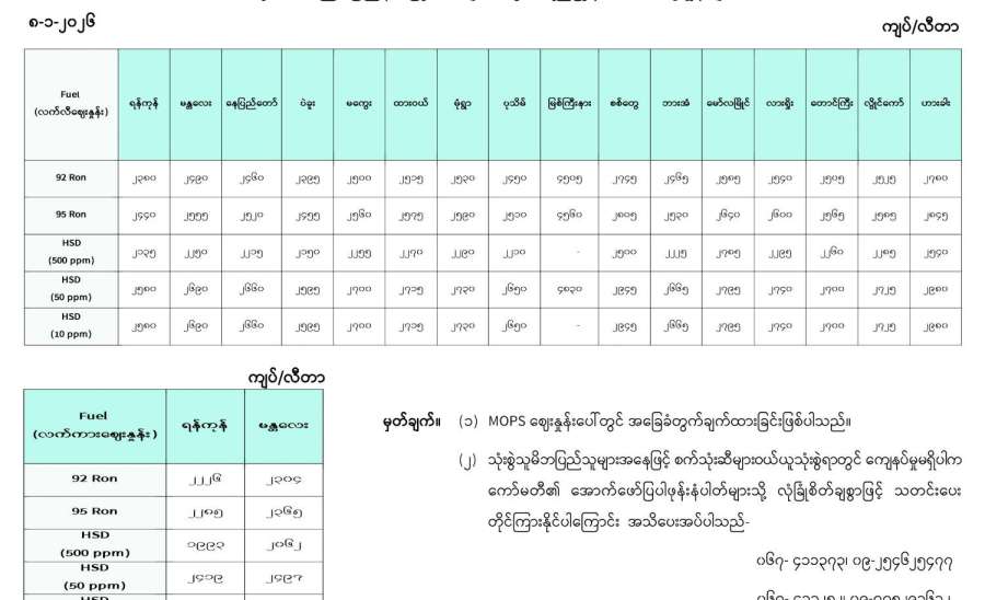 ရန်ကုန်မြို့နှင့် မန္တလေးမြို့အတွက် ရည်ညွှန်းလက်ကားဈေးနှုန်းများနှင့် ပြည်ထောင်စုနယ်မြေ နေပြည်တော်၊ တိုင်းဒေသကြီး/ပြည်နယ် မြို့တော်များအတွက် ရည်ညွှန်းလက်လီဈေးနှုန်းများ