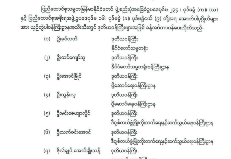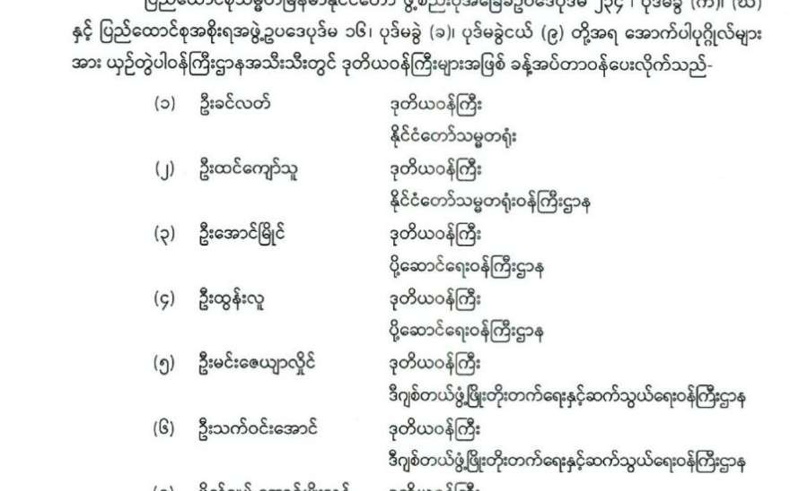 ဒုတိယဝန်ကြီးများ ခန့်အပ်တာဝန်ပေးခြင်း