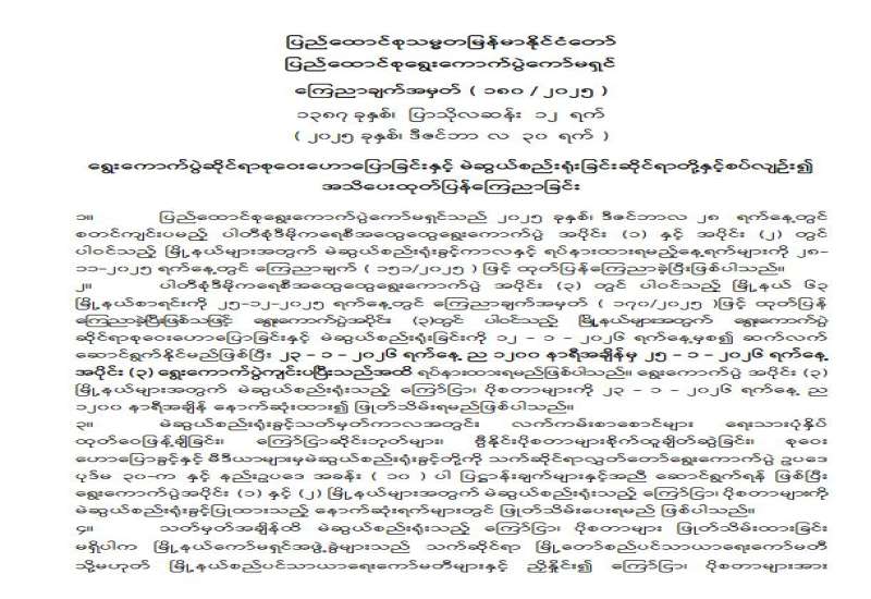ရွေးကောက်ပွဲဆိုင်ရာစုဝေးဟောပြောခြင်းနှင့် မဲဆွယ်စည်းရုံးခြင်းဆိုင်ရာတို့နှင့်စပ်လျဉ်း၍ အသိပေးထုတ်ပြန်ကြေညာခြင်း