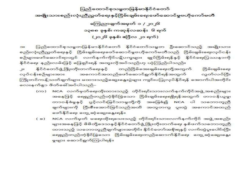 ပြည်ထောင်စုသမ္မတမြန်မာနိုင်ငံတော် အမျိုးသားစည်းလုံးညီညွတ်ရေးနှင့် ငြိမ်းချမ်းရေးဖော်ဆောင်မှုဗဟိုကော်မတီ ကြေညာချက်အမှတ် ၁ / ၂၀၂၆