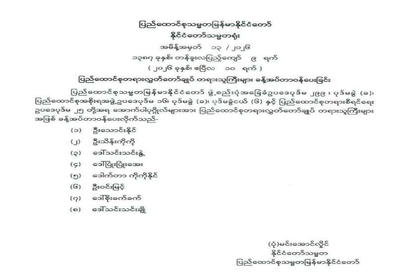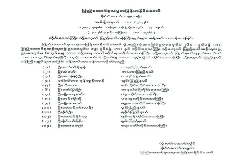 နေပြည်တော်ကောင်စီဥက္ကဋ္ဌ ခန့်အပ်တာဝန်ပေးခြင်း