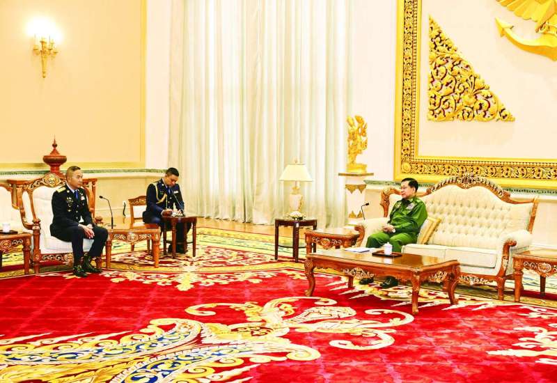 နိုင်ငံတော်လုံခြုံရေးနှင့်အေးချမ်းသာယာရေးကော်မရှင်ဥက္ကဋ္ဌ တပ်မတော်ကာကွယ်ရေးဦးစီးချုပ် ဗိုလ်ချုပ်မှူးကြီး မင်းအောင်လှိုင်သည် ထိုင်းဘုရင့်တပ်မတော်လေတပ်ဦးစီးချုပ် Air Chief Marshal Sakesan Kantha ဦးဆောင်သည့် ကိုယ်စားလှယ်အဖွဲ့အား ယနေ့နံနက်ပိုင်းတွင် နေပြည်တော်ရှိ ဇေယျာသီရိဗိမာန် ဧည့်ခန်းမဆောင်၌ လက်ခံတွေ့ဆုံသည်။