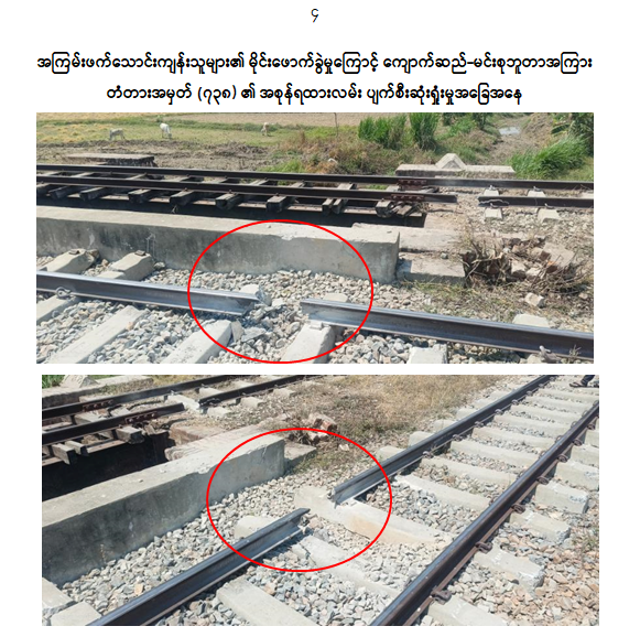 ယနေ့ နံနက် ၀၈:၄၀ ခန့်တွင် မန္တလေးတိုင်းဒေသကြီး၊ ကျောက်ဆည်မြို့နယ်၊ ရန်ကုန်- မန္တလေးရထားလမ်းပိုင်းအတွင်း ကျောက်ဆည်-မင်းစုဘူတာအကြား၊ မိုင် ၃၅၃/၂၄ နှင့် ၃၅၄/၁ ကြား တံတားအမှတ် ၇၃၈ ၏ အစုန်/အဆန် ပေ ၂၀ သံဘောင်တံတားနှင့် ကွန်ကရစ်တံတားများ ပေါ်တွင် မိုင်းပေါက်ကွဲမှု ဖြစ်ပွားခဲ့ကြောင်း သတင်းအရနယ်မြေခံလုံခြုံရေးအဖွဲ့မှ သွားရောက်စစ်ဆေးခဲ့ရာတံတားများရှိ အရှေ့ဘက်ခြမ်းသံလမ်းများ (၂) ပေခန့်စီ ပြတ်ထွက်နေပြီး မကွဲသေး သော လက်ကျန် မိုင်း(၁)လုံး အားတွေ့ရှိခဲ့သဖြင့် မင်းစု-ကျောက်ဆည် အစုန်/အဆန်လမ်းပိုင်းများအား နံနက်၈ နာရီ ၅၀ မိနစ်အချိန်တွင် ခေတ္တပိတ်ခဲ့ရသည်။