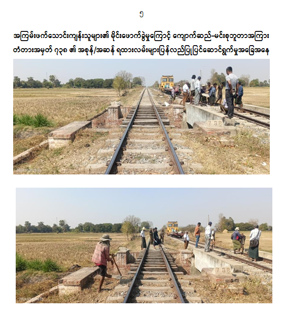 နိုင်ငံတော်အစိုးရအနေဖြင့် အများပြည်သူခရီးသွားလာမှုနှင့် ကုန်စည်ပို့ဆောင်မှု အဆင်ပြေချောမွေမြန်ဆန်စေရေးအတွက် ရထားလမ်းအခြေခံအဆောက်အဦများ ပိုမိုကောင်းမွန်လာစေရေး၊ ရထားပို့ဆောင်ရေးစနစ်ကို အဆင့်မြှင့်တင်နေသည့် စီမံကိန်းလုပ်ငန်းများကို ရည်မှန်းချက်ထားရှိ၍ စီမံဆောင်ရွက်ပေးလျက်ရှိသော်လည်း အကြမ်းဖက်သောင်းကျန်းသူများ ကမူ နိုင်ငံတော်ပိုင် ရထားစက်ခေါင်း၊ တွဲများနှင့် ခရီးသည်များ၊ ကုန်စည်များထိခိုက်ပျက်စီးစေရေး၊ ပြည်သူများအသက်အန္တရာယ်ထိခိုက်ပြီး စိတ်မချမ်းမြေ့စေရေးရထားဖြင့် ခရီးသွားလာမှမပြုရဲအောင် ခြိမ်းခြောက်ခြင်းတို့ကို ယုတ်မာပက်စက်သော ရည်ရွယ်ချက်များဖြင့် အကြိမ်ကြိမ်ကျူးလွန်နေကြသောကြောင့် အဆိုပါအကြမ်းဖက်သောင်းကျန်းသူများ၏ ယုတ်မာပက်စက်မှုများအပေါ် ဒေသခံပြည်သူတစ်ရပ်လုံးက ပြင်းထန်စွာဆန့်ကျင်ကန့်ကွက် ရှုတ်ချလျက်ရှိကြောင်း သတင်းရရှိပါသည်။