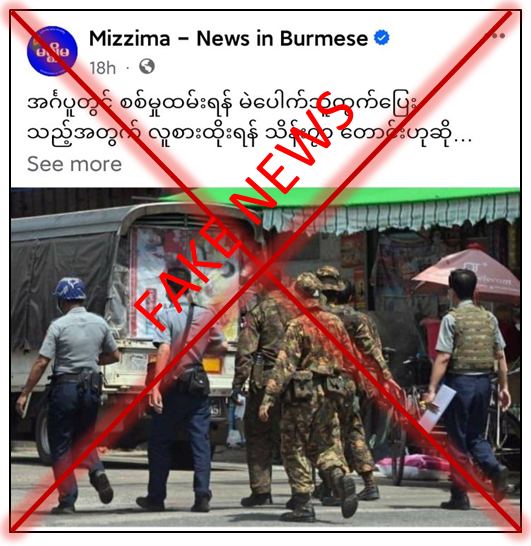 ဧရာဝတီတိုင်းဒေသကြီး၊ အင်္ဂပူမြို့နယ်၊ ကွင်းကောက်ကျေးရွာတွင် စစ်မှုထမ်းဆောင်ရန် စာရင်းပေးသွင်းခံရသူ လူငယ်တစ်ဦး ထွက်ပြေးသွားသည့်အတွက် လူစားထိုးရန် အဆိုပါလူငယ်၏အဘွားဖြစ်သူထံ ကျေးရွာအုပ်ချုပ်ရေးမှူးက ကျပ်သိန်း ၇၀ တောင်းခံနေကြောင်း သတင်းတု၊ သတင်းအမှားမျာကို တရားမဝင်ပြည်ဖျက်မီဒီယာ Mizzima က ပြည်သူများ အထင်အမြင်လွဲမှားစေရန် မဟုတ်မမှန် လုပ်ကြံရေးသား ဖြန့်ဝေနေသည်ကိုတွေ့ရှိရသည်။