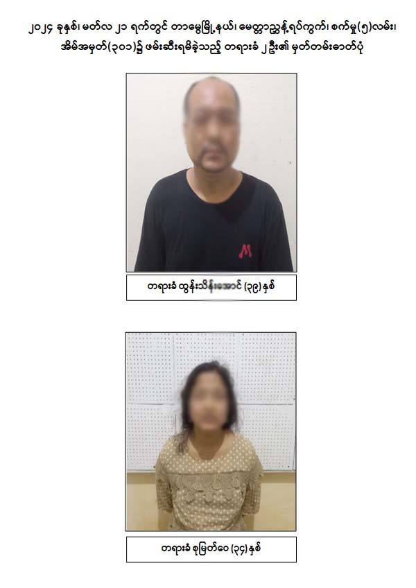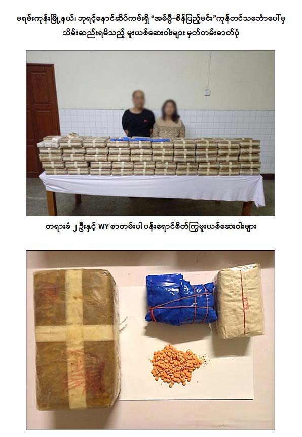 သို့ဖြစ်၍ တရားခံများအား ဥပဒေအရ ထိရောက်စွာအရေးယူနိုင်ရေး ဆက်လက်ဆောင်ရွက်သွားမည်ဖြစ်ကြောင်း၊ တရားခံပြေး သန့်ဇင်ဦးနှင့် ကျော်ပိုင်သူ အပါအဝင် ဆက်စပ်တရားခံများအား ဖော်ထုတ်ဖမ်းဆီးရမိရေး ဆက်လက်ဆောင်ရွက်လျက်ရှိ ကြောင်းနှင့် မူးယစ်ဆေးဝါးသယ်ဆောင်သည့် သတင်းများရရှိပါက သက်ဆိုင်ရာသို့ လျှို့ဝှက်စွာ သတင်းပေး တိုင်ကြားနိုင်ပါကြောင်း၊ သတင်းပေးသူနှင့် ပူးပေါင်းပါဝင်ဖမ်းဆီးပေးသူများအား ထိုက်တန်စွာလျှို့ဝှက်၍ ဆုငွေများချီးမြှင့်ပေးမည်ဖြစ်ကြောင်း အသိပေးသတင်းထုတ်ပြန် အပ်ပါသည်။