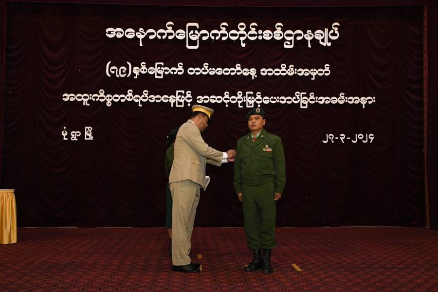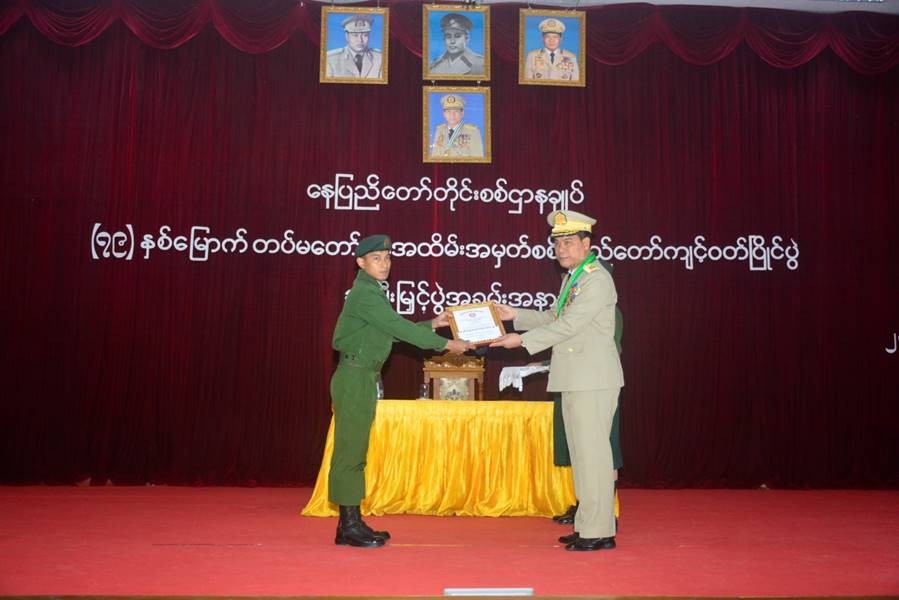 ထို့နောက် (၇၉) နှစ်မြောက်တပ်မတော်နေ့အထိမ်းအမှတ် စစ်သည်တော်ကျင့်ဝတ်ပြိုင်ပွဲများတွင် ဆုရရှိကြသူများ၊ တပ်မတော် (ကြည်း၊ရေ၊လေ) အားကစား ပြိုင်ပွဲများ၊ သင်တန်းများတွင် ဆုရရှိအောင် စွမ်းဆောင်နိုင်ခဲ့ကြသူများနှင့် အဆင့်တိုးမြှင့်ခြင်းခံရသည့် စစ်သည်များအား သက်ဆိုင်ရာတိုင်းစစ်ဌာနချုပ်များမှ တိုင်းမှူးများနှင့်တာဝန်ရှိသူများက အဆင့်တံဆိပ်များ၊ ဂုဏ်ထူးဆောင် လက်မှတ်များနှင့် ဂုဏ်ပြုဆုငွေများ ပေးအပ်ချီးမြှင့်ကြသည်။