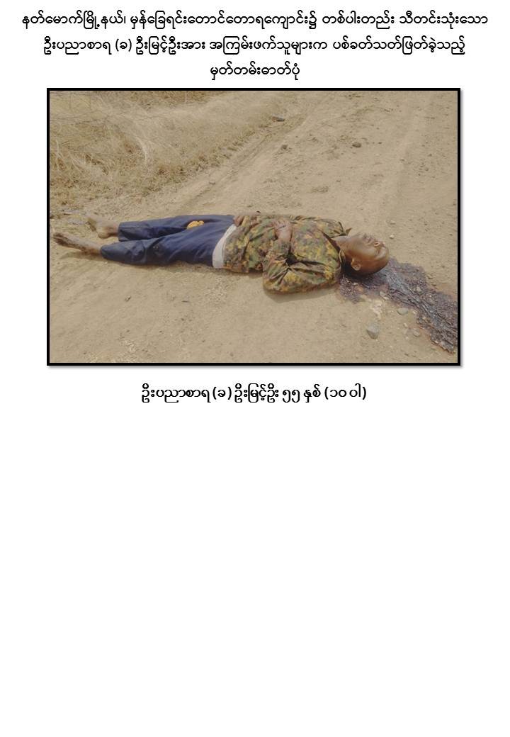 အလားတူ မတ်လ ၂၉ ရက် နေ့လယ် ၂ နာရီခန့်တွင် နတ်မောက်မြို့နယ်၊ မြင်းတဲကြီးကျေးရွာအနီးရှိ မှန်ခြေရင်းတောင်တောရကျောင်း၌ တစ်ပါးတည်း သီတင်းသုံးနေထိုင်သည့် ဆရာတော် ဘဒ္ဒန္တ ပညာစာရ သက်တော် (၅၅) နှစ်၊ ဝါတော်(၁၀)ဝါအား PDF အမည်ခံအကြမ်းဖက်သမားများက ဖမ်းဆီးခေါ်ဆောင်သွားခဲ့ပြီး မြင်းတဲကြီးကျေးရွာအနီးလမ်းပေါ်၌ တပ်မတော်ယူနီဖောင်းအင်္ကျီနှင့် ရဲတပ်ဖွဲ့ယူနီဖောင်း ဘောင်းဘီတို့အားဝတ်ဆင်စေကာ ဦးခေါင်းအား သေနတ်ဖြင့် ရက်စက်စွာပစ်ခတ်သတ်ဖြတ်ခဲ့သဖြင့် ပျံလွန်တော်မူခဲ့ကြောင်း သိရှိရသည်။