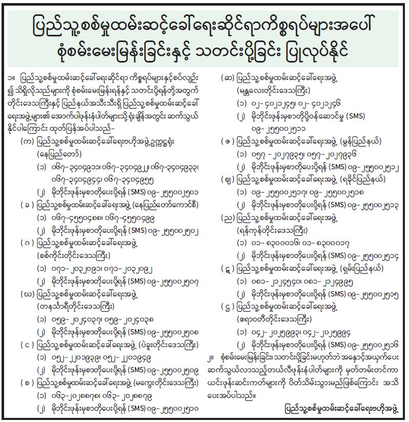 ပြည်သူ့စစ်မှုထမ်းဆင့်ခေါ်ရေးဆိုင်ရာ ကိစ္စရပ်များအပေါ် စုံစမ်းမေးမြန်းခြင်းနှင့် သတင်းပို့ခြင်းပြုလုပ်နိုင် 04/04/2024