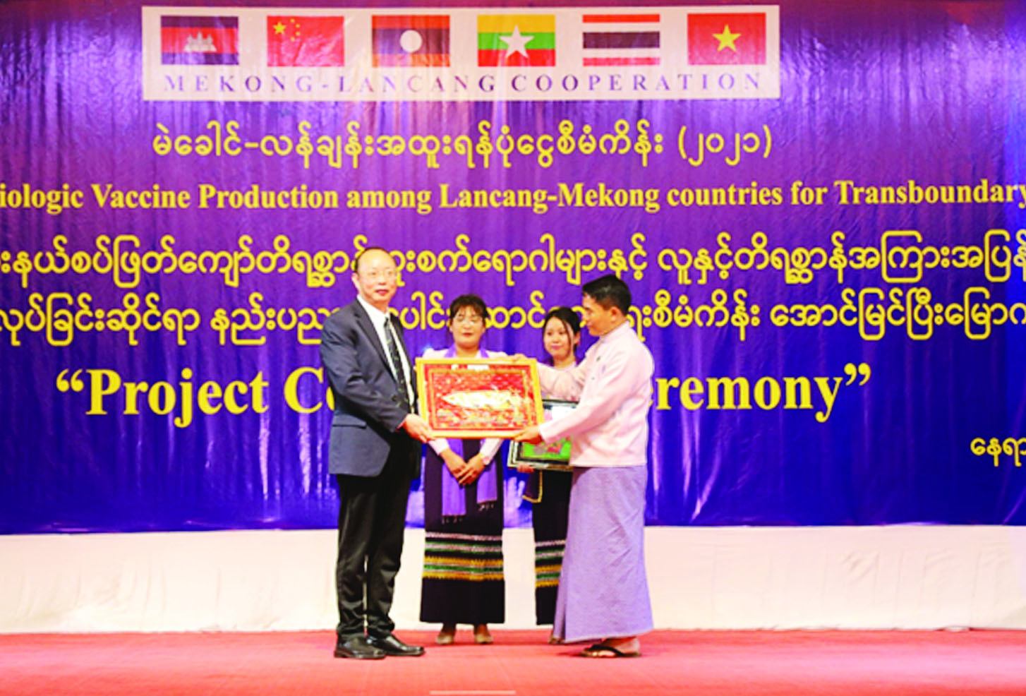 မွေးမြူရေးနှင့် ကုသရေးဦးစီးဌာနက အကောင် အထည်ဖော်ဆောင်ရွက်ခဲ့သည့် မဲခေါင်-လန်ချန်း နိုင်ငံများအကြား နယ်စပ်ဖြတ်ကျော် တိရစ္ဆာန်ကူးစက်ရောဂါကာကွယ်ဆေး ထုတ်လုပ်ခြင်းဆိုင်ရာ အထူးရန်ပုံငွေစီမံကိန်း (၂၀၂၁) စီမံကိန်းလုပ်ငန်းများ အောင်မြင်ပြီးမြောက်ကြောင်း ကြေညာခြင်းအခမ်းအနားကို ယနေ့နေပြည်တော် မင်္ဂလာသီရိဟိုတယ်၌ကျင်းပရာ စိုက်ပျိုးရေး၊ မွေးမြူရေးနှင့်ဆည်မြောင်းဝန်ကြီးဌာန ပြည်ထောင်စုဝန်ကြီးဦးမင်းနောင်၊ ဒုတိယဝန်ကြီးဒေါက်တာအောင်ကြီး၊ မြန်မာနိုင်ငံဆိုင်ရာ တရုတ်ပြည်သူ့သမ္မတနိုင်ငံသံရုံးမှ ဒုတိယအတွင်းဝန် Mr. Zheng Zhihong (မစ္စတာ ကျန်ကျိဟုန်) နှင့် ကိုယ်စားလှယ်များ ၊ ညွှန်ကြားရေးမှူးချုပ်များ၊ ပါမောက္ခချုပ်များ၊ စီမံကိန်းတာဝန်ရှိသူများတက်ရောက်ကြသည်။